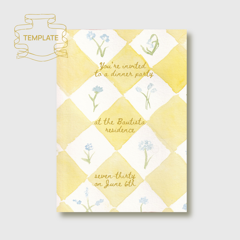 Brighten your next garden party with this sunny digital template—featuring cheerful yellow checks and blue blooms that bring a touch of handcrafted elegance to your next gathering.